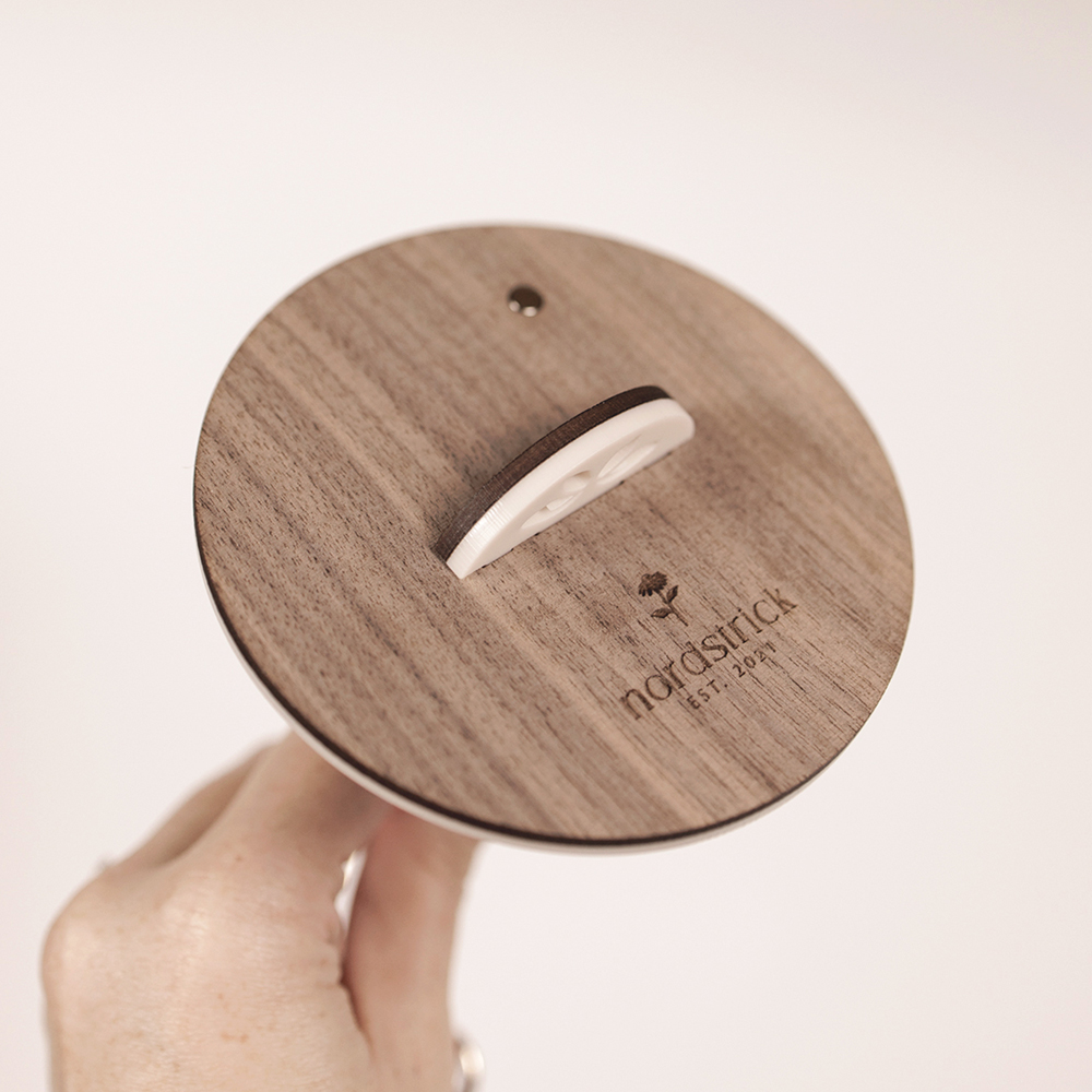 Der Garnhalter wird komplett von Hand in unserer Werkstatt gefertigt. Er kombiniert edles Acryl mit hochwertigem Edelholzfurnier. Das miteinander verbundene Material sorgt für zusätzliche Stabilität.