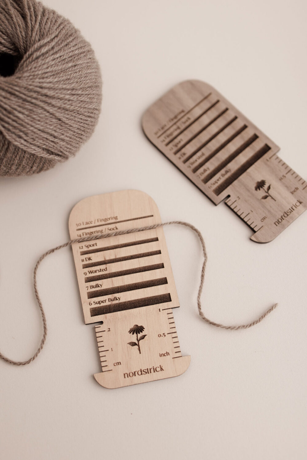Der Garnstärkenmesser oder auch Wollstärkenmesser soll dir dabei helfen die Stärke des Garnes zu bestimmen. Du kannst den Faden hierfür in den vorgesehenen Längen auflegen oder den Faden in der Ausbuchtung dicht nebeneinander aufwickeln. Die Anzahl der Wicklung zeigt wiederum im oberen Bereich die passende Garnstärke an. Lässt sich der Faden zum Beispiel 7 Mal umwickeln, sollte dieses ein Bulky Garn sein. Ein feineres Garn lässt sich bis zu 30 Mal umwickeln und zeigt an, dass es sich somit um eine Lace Stärke handelt.