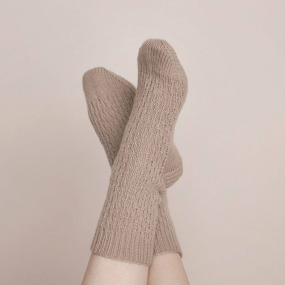 Die Socken werden nahtlos von oben nach unten gestrickt, beginnend mit einem einfachen Rippenbündchen, dass in ein schlichtes Muster übergeht, welches allein durch rechts und links gestrickte Maschen entsteht. Die Ferse wird in Hin- und Rückreihen gearbeitet und anschließend durch verkürzte Reihen geformt. Der Fuß wird bis zur Spitze in Runden fertig gestrickt, die Länge kann dabei angepasst werden.