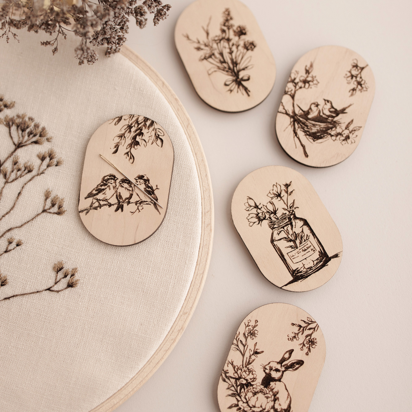 Eine kleine Kollektion, inspiriert von der Schönheit unseres Gartens. Zwischen Vögeln, die sich zwitschernd unterhalten und einem Vogelpaar in ihrem Nest, finden sich blühende Blumen an jeder Ecke und ganz versteckt ein kleiner Hase, der das Schauspiel beobachtet.