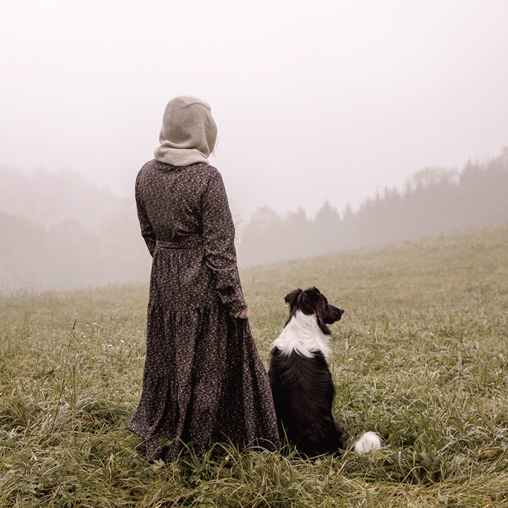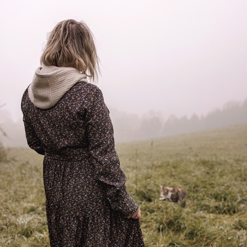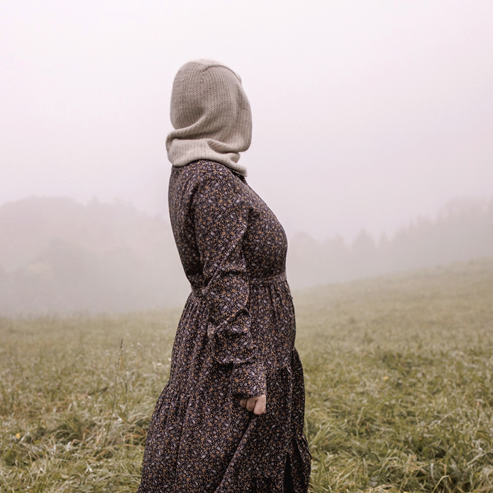 Dichter Nebel zieht über Wiesen, ein kühler Wind weht sanft über das Gesicht und die Welt ist eingehüllt in Stille. Tysta, das schwedische Wort für diesen ruhigen Moment. Und zudem ein passender Name für die hübsche Kapuze, die den Kopf weich und zart umhüllt. Stille.